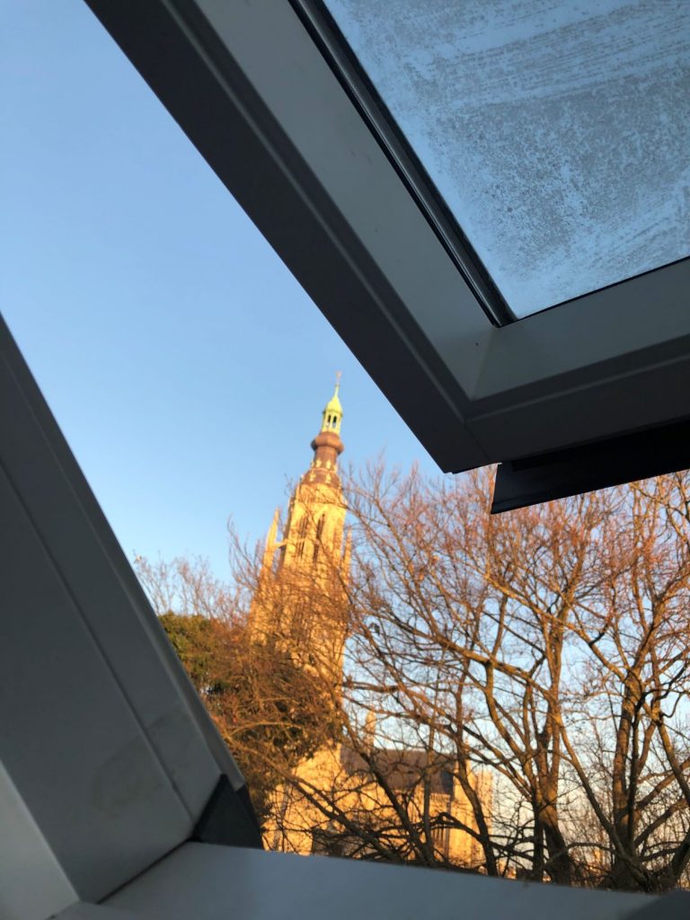 Vanaf de bovenste woonlaag ’n prachtig uitzicht op de Grote Kerk van Breda. Wat wil je nog meer !
